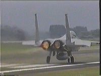 逆にアフターバーナー使用においての不利点は、燃料消費量が、不使用時に比べて2〜4倍に増加することです。ちなみに私が操縦してきた機体の中でアフターバーナー付きエンジンを搭載していた航空機で、T−2(機体についてはAircraftページをご覧下さい)がありましたが、実際にアフターバーナーを使用してみて、T−2は一般的なアメリカ製の機体の戦闘機が装備するエンジンよりかなり小型ではありましたが、相当な燃料消費量でした。約4トン近くある機内燃料が、エンジンのみの使用だと約2時間くらいは持つのですが、アフターバーナーを使用すると、たったの30分足らずで全部消費してしまう程です。数値だけだとちょっとピンとこないと思われますので、これを身近なもので例えてみると、満杯に入れたお風呂の浴槽のお湯が、約2分で消費してしまうと思ってもらえると、その燃料消費量がどんなものか想像できるかと思います。(ただし、この例えはエンジン1基当たりの消費量の例えですので、エンジンが2基付いている飛行機の場合は、これの2倍の勢いで燃料を消費していきます。)